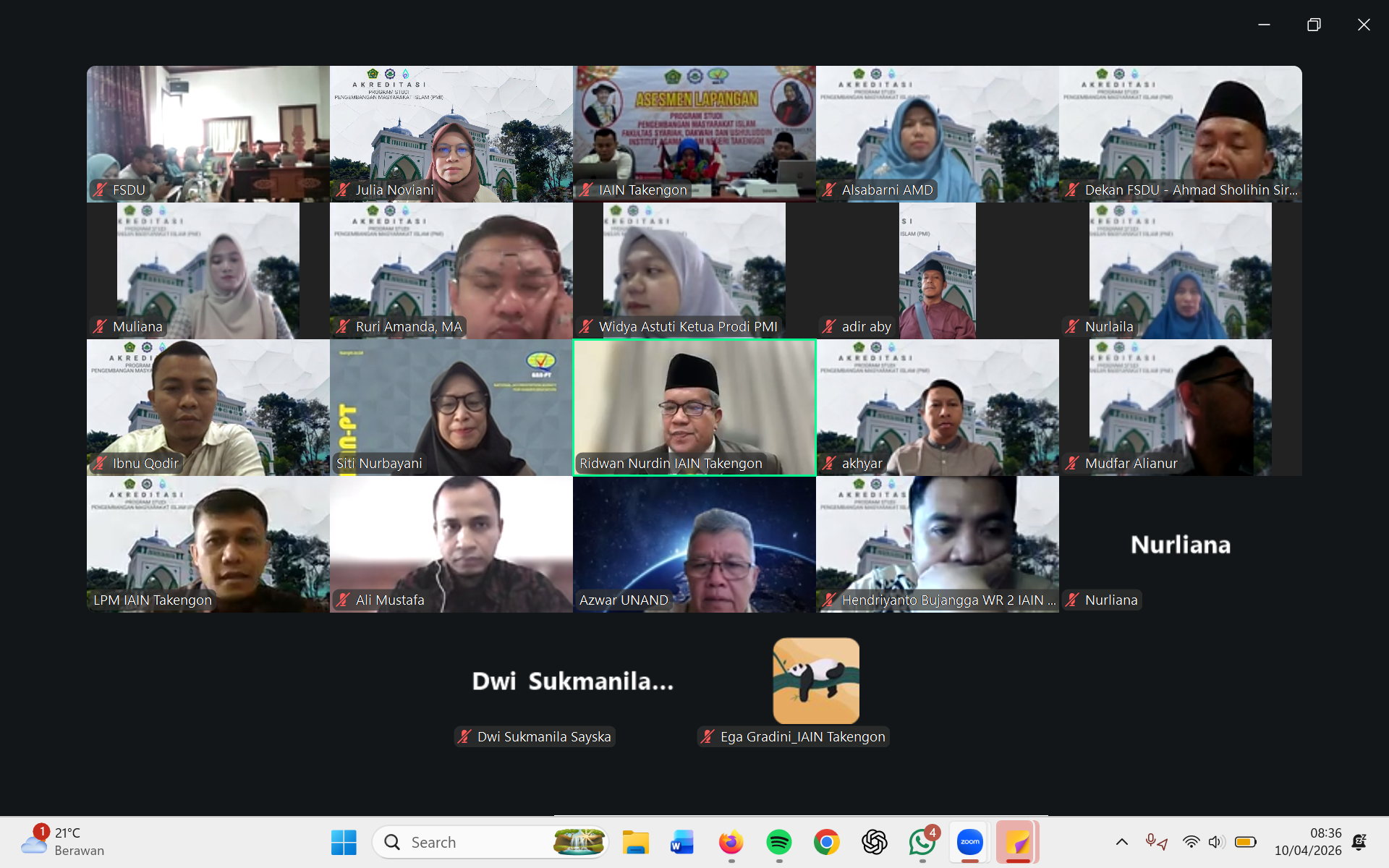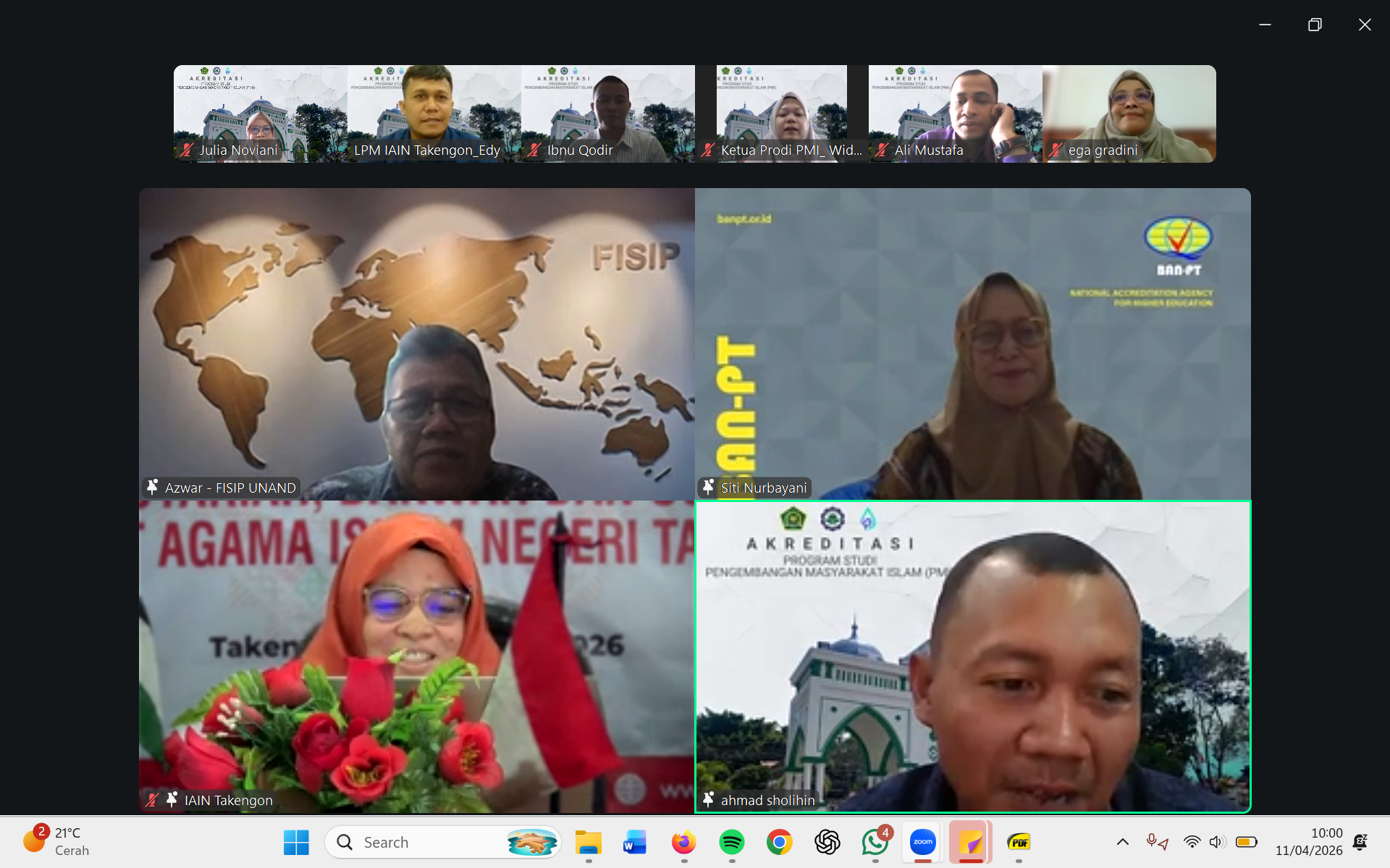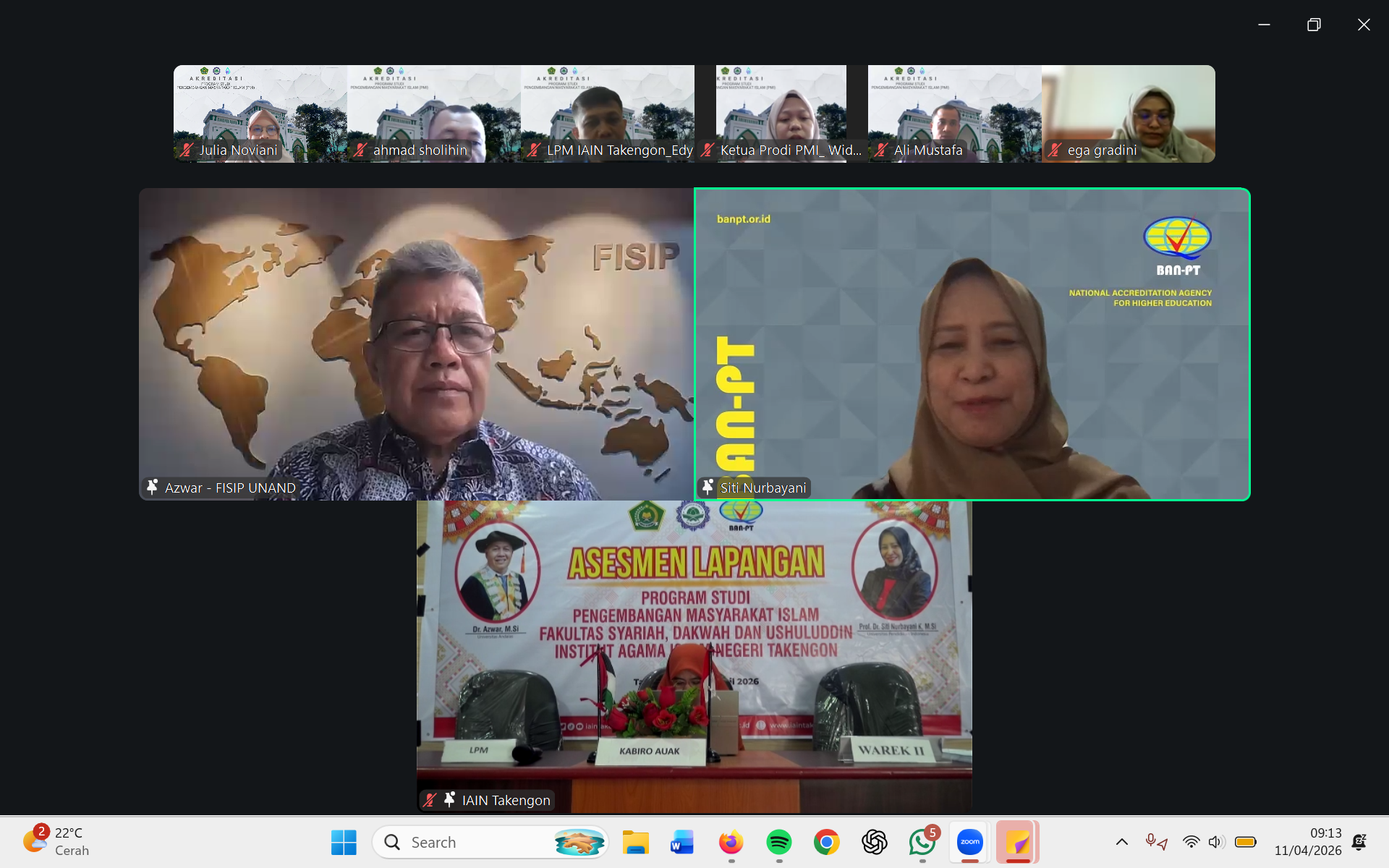 Institut Agama Islam Negeri Takengon melalui Lembaga Penjaminan Mutu (LPM) melaksanakan asesmen lapangan Program Studi Pengembangan Masyarakat Islam (PMI) bersama BAN-PT pada tanggal 10–12 April 2026 yang dilaksanakan secara daring.